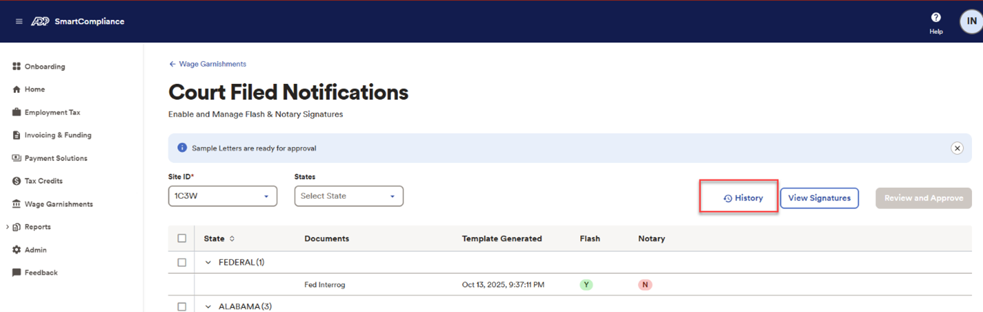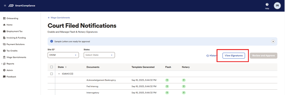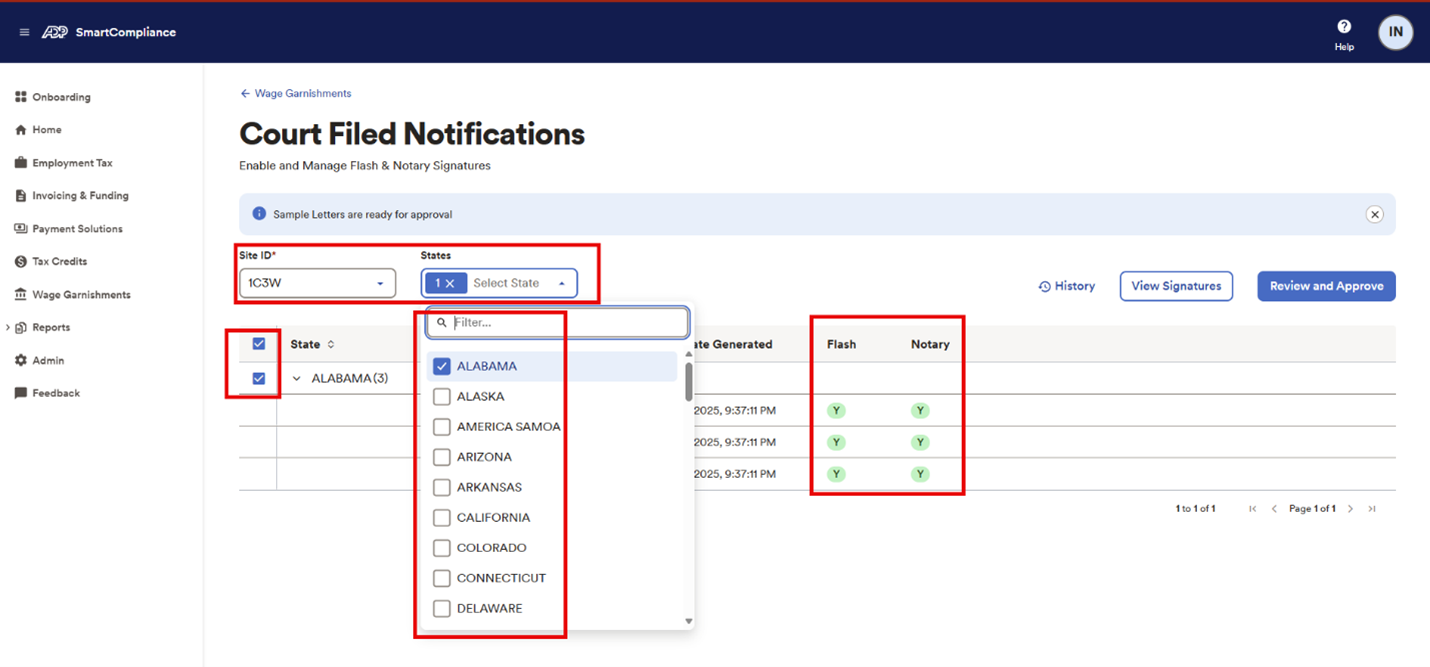 When you make changes to your Flash signatures, you need to provide authorization to ADP to utilize the new signatures in conjunction with your court-filed notifications (CFNs or letters), and review and approve the legal sufficiency of the CFN templates ADP will use for your letters. You’ll need to select each state you want to use Flash signatures with and approve the associated template(s). Click Review and Approve (as seen in screenshot below).