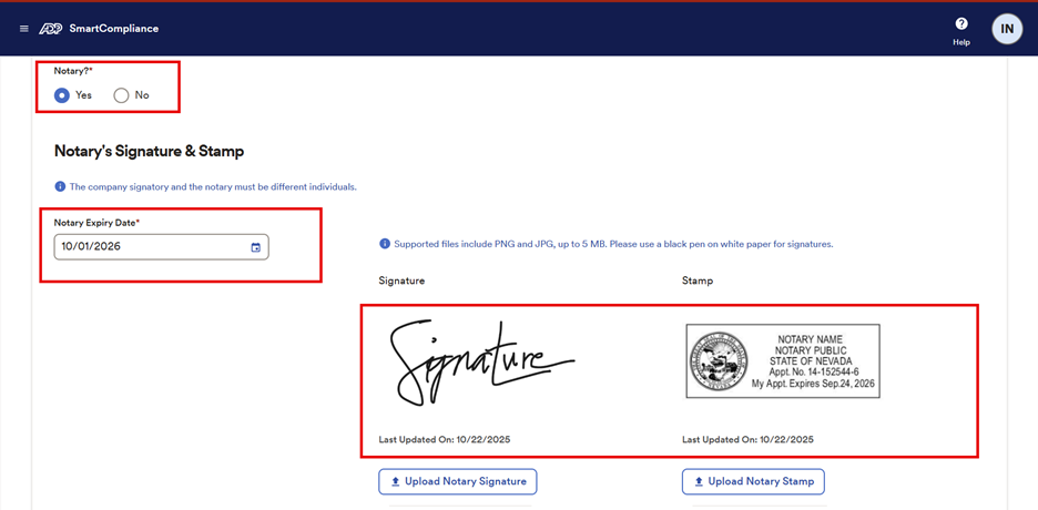 To the extent you elect to use notary flash signature and stamp on your CFNs, it is important that you thoroughly research each state’s notarization requirements (including the requirements of the state in which the notary is licensed) with your legal department before deciding to proceed with the flashing of notary signature(s) and stamp information. To assist with such requirements, a sample of each CFN template is available on ADP SmartCompliance®. Please have your authorized signer and notary manually sign and notarize these samples in each other’s physical presence and retain copies of these forms.