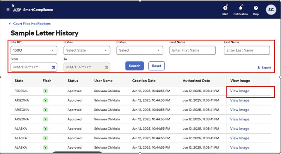 Next, choose the appropriate Site ID for the list of Court-Filed Notification (CFN or letters) templates you wish to have ADP use your Flash signatures on, along with Flash and Notary indicators. You can also use the State filter to further narrow your search.