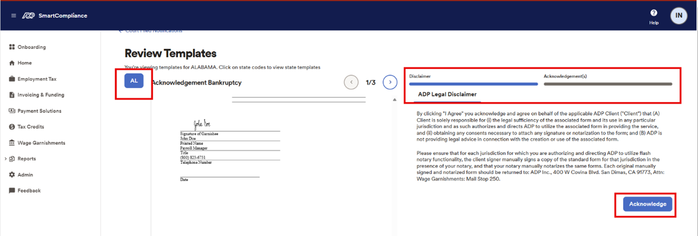 “As a third-party service provider, ADP does not sign or notarize court-filed notifications (CFNs or letters) for clients in its own name. Instead, ADP offers you the options of having ADP apply or “flash” digital images of your authorized signer’s signature and your notary’s signature and stamp onto your CFNs. ADP is not responsible for the design or compliance of Flash Signatures and makes no representations, warranties or determinations regarding the compliance of the use of Flash Signatures on CFNs. To the extent you elect to use Flash Signatures on your CFNs, you are responsible for ensuring that such signatures are, in your company’s view, consistent with your company’s compliance requirements, and that you thoroughly research each state’s notarization requirements (including the requirements of the state in which the notary is licensed) with your legal department before deciding to proceed with the flashing of notary signature(s) and stamp information.”