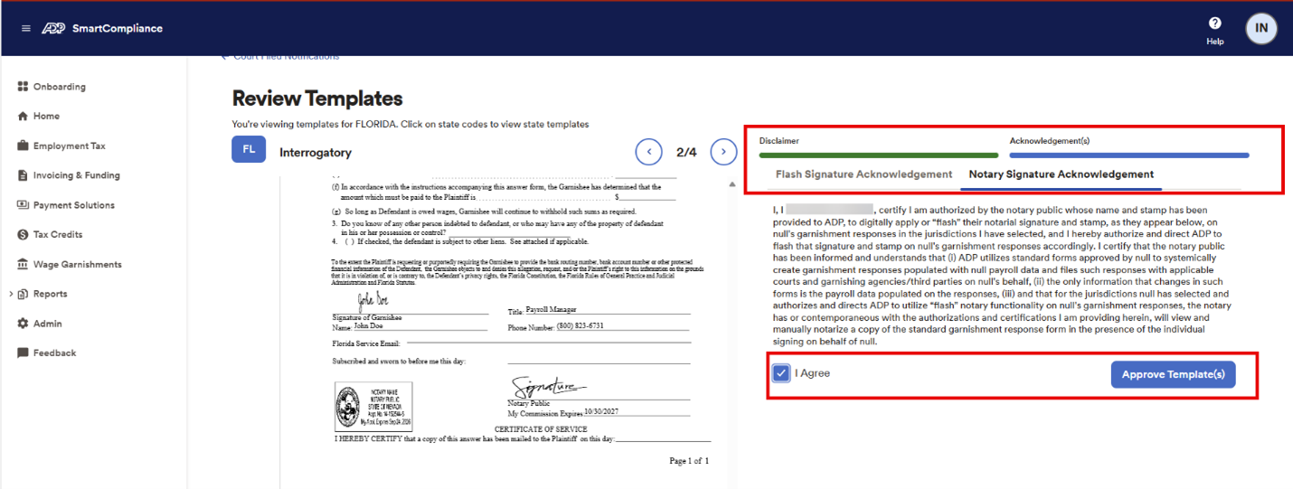 Log on to ADPSmartCompliance® to review and approve the template (see image below). ADP will then utilize the template to generate your answers for federal writs, affix your pre-approved flash signature (if you’ve authorized this), and file them with courts for you.